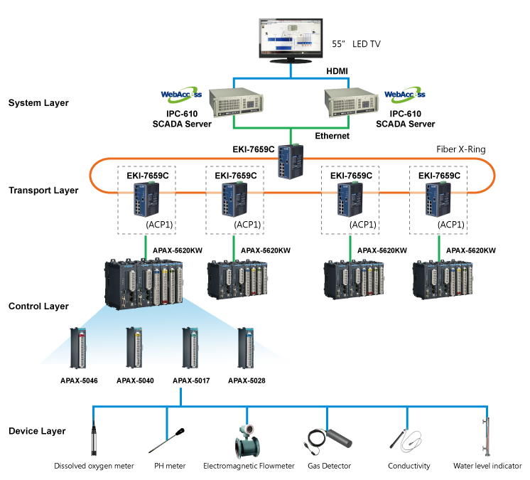 ?廢水處理廠是現(xiàn)代社會的基本基礎設施,用于凈化家庭和企業(yè)產(chǎn)生的廢水。它的一天24小時不間斷運行,廢水處理包括多個過程,以去除固體,有機化合物和其他物質。這樣復雜的工作流程需要仔細的管理,僅由工廠人員監(jiān)督是不夠的。此外,水源水質可即時改變,任何疏忽或失誤都可能導致處理不當或造成環(huán)境污染。因此,自動監(jiān)測和控制系統(tǒng)在確保處理后的廢水排入下水道或河流之前,要滿足環(huán)境法規(guī)和政府標準,一直發(fā)揮著非常重要的作用。 但是,如何以最小的成本有效地創(chuàng)建集中的監(jiān)控管理系統(tǒng)以獲得最大的價值,如何確保系統(tǒng)的穩(wěn)定性并保留將來的擴展能力,所有這些都會受到硬件和軟件選擇的影響。研華提供功能強大的軟件和廣泛的硬件產(chǎn)品組合,包括先進的WebAccess SCADA軟件,帶有I / O模塊的APAX可編程自動化控制器和EKI以太網(wǎng)交換機,使系統(tǒng)集成商可以通過一站式購買快速完成廢水處理廠項目,而不必擔心兼容性。通過提供完全冗余的功能,該整體解決方案具有最大的可靠性,可以確保不間斷運行。與此同時WebAccess強大而豐富的功能使開發(fā)人員能夠輕松獲取數(shù)據(jù),并集成多個節(jié)點或平臺,以滿足項目當前和未來的需求,同時降低開發(fā)和維護成本。