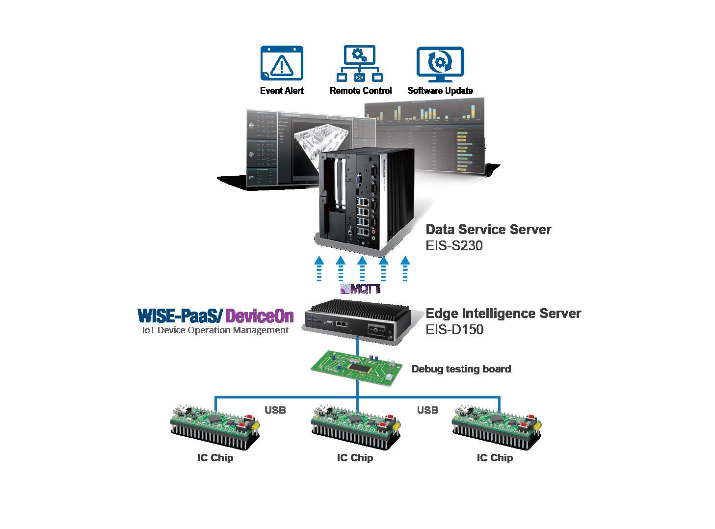本案客戶在測試生產(chǎn)線上共構(gòu)建了數(shù)百臺邊緣智能服務(wù)器EIS-D150,各自連接到不同芯片測試設(shè)備,數(shù)據(jù)上傳中控室數(shù)據(jù)管理服務(wù)器EIS-S230進行集中式管理監(jiān)督,EIS-S230基于容器與微服務(wù)構(gòu)架,具有資源水平擴增與動態(tài)平衡等功能,提供高擴充性與高穩(wěn)定性的平臺服務(wù)。WISE-PaaS/DeviceOn平臺整合了所有物聯(lián)網(wǎng)和云端應(yīng)用所需要的開發(fā)工具與文件,包括提供儀表板建置器予客戶建立客制化的儀表板,進行數(shù)據(jù)可視化呈現(xiàn),并方便用戶透過直覺式界面進行裝置管理;此外,客戶可利用Node-RED數(shù)據(jù)流程邏輯設(shè)計工具有效的改善開發(fā)測試流程,并透過OTA功能進行遠(yuǎn)端軟件更新、快速布署測試程序。