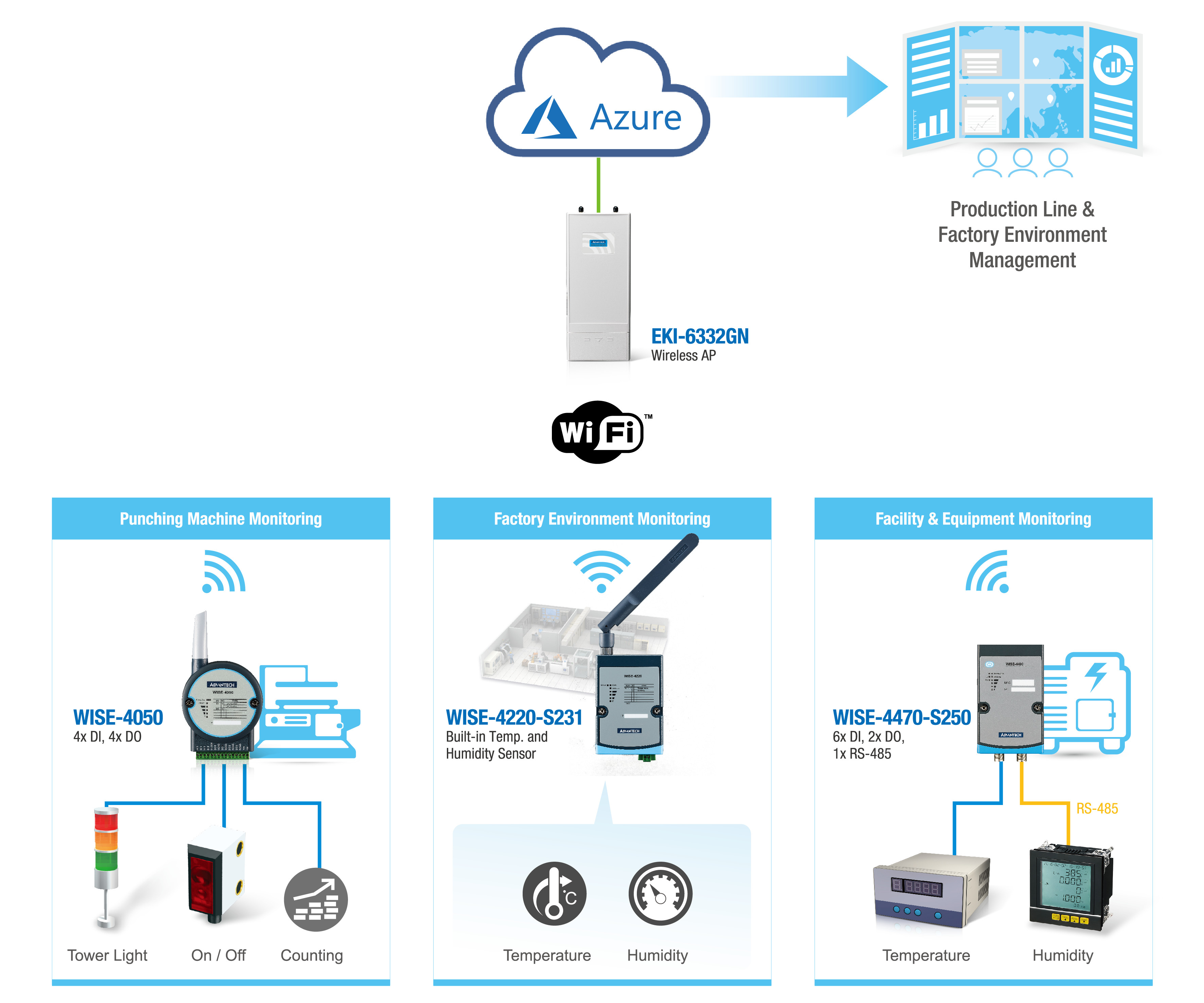 大多數(shù)現(xiàn)場(chǎng)設(shè)備是沒有PLC的沖壓機(jī)或沒有開放通信端口的封閉系統(tǒng)。根據(jù)設(shè)備的不同情況,研華公司的WISE-4000系列和EKI-6332GN Wi-Fi接入點(diǎn)采用了多個(gè)IoT無線I / O模塊,以滿足金屬加工廠將生產(chǎn)設(shè)備聯(lián)網(wǎng)的需求并能夠監(jiān)控設(shè)備和整體設(shè)施。