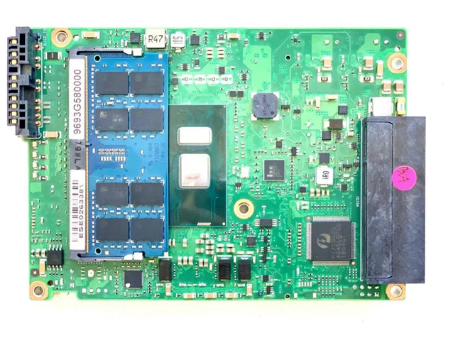 內(nèi)存的大小對于處理器性能有很大影響,畢竟各種數(shù)據(jù)都是要經(jīng)過內(nèi)存來送給計(jì)算機(jī)。在這塊電路板上搭載有兩個(gè)DDR4內(nèi)存卡槽,對稱的分布在電路板的兩面上。官方資料中說最大支持到32GB,也就是一個(gè)內(nèi)存卡槽最大支持16GB的內(nèi)存條。實(shí)測的這臺控制器上只插有一根8GB內(nèi)存條,但足以應(yīng)對小規(guī)模的應(yīng)用場合。
