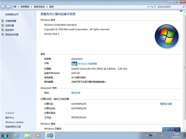研華WISE-5580邊緣控制器系統(tǒng)配置 還是那個(gè)熟悉的Windows系統(tǒng)界面,在“我的電腦”的屬性中可以查看到這臺計(jì)算機(jī)的更多基本信息。界面顯示這臺計(jì)算機(jī)的制造商是Advantech(研華),安裝的是64位系統(tǒng),8G內(nèi)存,搭載英特爾賽揚(yáng)3955U處理器,主頻是2.00GHz。