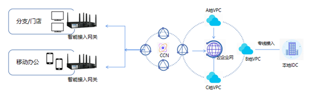 智能接入網(wǎng)關(guān)可以將機構(gòu)(IDC/分支機構(gòu)/門店等)接入數(shù)據(jù)中心,利用云上資源進行彈性伸縮,輕松構(gòu)建混合云。