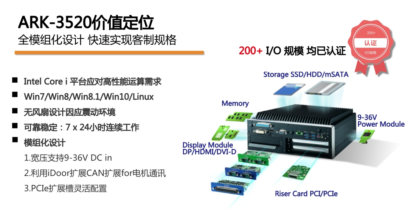 ![]() 研華嵌入式無風(fēng)扇工控機(jī),采用模組化設(shè)計,將功能模塊做選配設(shè)計,因?qū)Ω骺蛻粜枨笞龌蚝喕蚍钡囊?guī)格配置,ARK-3520此單一機(jī)種可以達(dá)到200多種規(guī)格,且全部認(rèn)證,以便快速打造客戶方案。針對AGV內(nèi)部供電不穩(wěn)定,ARK-3520還增設(shè)寬壓模塊,規(guī)格9-36V,基本可以覆蓋絕大多數(shù)工業(yè)場景應(yīng)用;透過IDoor擴(kuò)展CAN BUS,以連接電機(jī);還有靈活的PCI(e)擴(kuò)展槽,以連接運(yùn)動控制卡,如有需要請致電聯(lián)系我們 以上案例來自研華官網(wǎng)