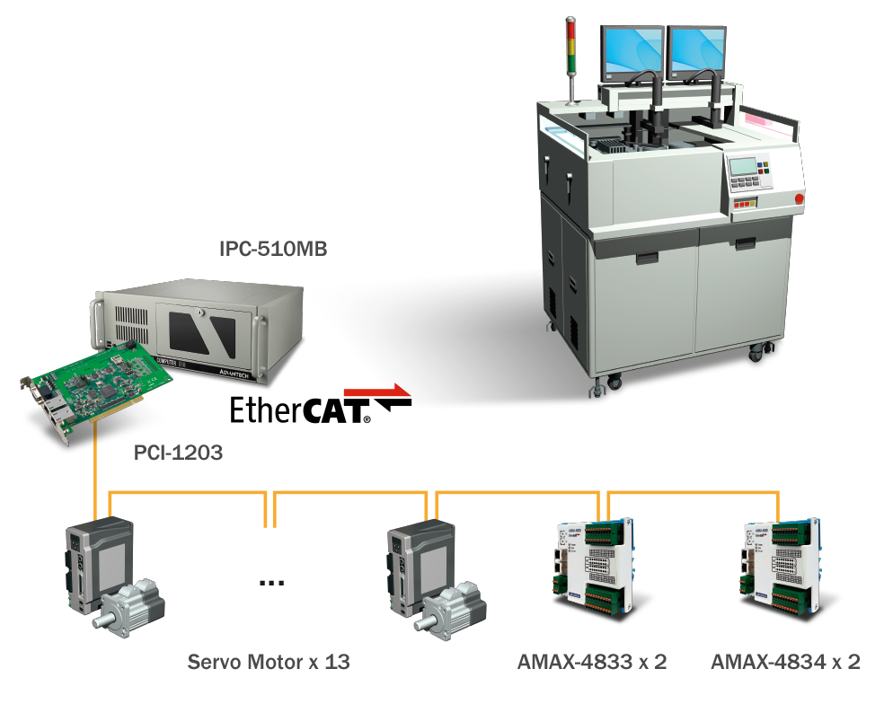 在這種情況下,“扭矩極限表”功能使設(shè)備的運(yùn)動(dòng)周期大大縮短(周期= 0.15秒/芯片; UPH = 24,000ea / hr);根據(jù)機(jī)器的特性,“ PT / PVT”功能滿足了用戶定義的S曲線,并且還實(shí)現(xiàn)了振動(dòng)抑制。另外,PCI-1203還支持13軸同步控制。使用研華強(qiáng)大而靈活的SoftMotion API,可以有效地開(kāi)發(fā)所有機(jī)器行為。