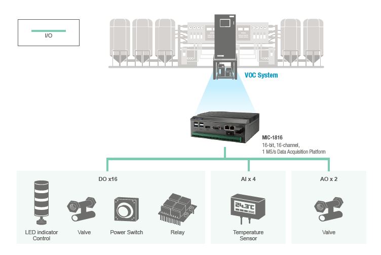 ▌▌系統(tǒng)描述 研華的MIC-1816是配有DAQ模塊的嵌入式計(jì)算機(jī)。該系統(tǒng)的緊湊,無風(fēng)扇設(shè)計(jì)使其成為有限空間安裝的理想選擇。在此項(xiàng)目中,MIC-1816安裝在機(jī)柜中,以連接熱電偶,進(jìn)氣門,氣門按鈕和帶LED指示燈的繼電器。這允許將VOC測量系統(tǒng)用于收集傳感器信號(hào)并控制相關(guān)設(shè)備,從而調(diào)節(jié)溫度和VOC濃度。 MIC-1816是業(yè)界首個(gè)嵌入式DAQ平臺(tái)。盡管該設(shè)備是緊湊型(165 x 130 x 59 mm)且手掌大小,但它提供了足夠的計(jì)算能力來滿足該項(xiàng)目的要求。該系統(tǒng)對(duì)集成的高度支持使該公司可以用一個(gè)平臺(tái)替換以前的“拼布”硬件。多功能I / O(包括模擬輸入,模擬輸出,數(shù)字輸入和數(shù)字輸出)允許用戶連接到多個(gè)設(shè)備并管理各種組件。此外,提供16位分辨率的數(shù)據(jù)采集可以提高測量的準(zhǔn)確性,并且可拆卸的接線盒可以直接連接到傳感器,以方便安裝和維護(hù)。 最后,為了防止盜版并保護(hù)客戶的知識(shí)產(chǎn)權(quán),研華可以將MIC-1816嵌入具有唯一設(shè)備ID的EEPROM中。使用此定制功能(應(yīng)要求提供),只有在設(shè)備ID與EEPROM中的設(shè)備ID匹配時(shí),MIC-1816系統(tǒng)才能運(yùn)行。這是為了防止其他制造商復(fù)制VOC測量系統(tǒng)的功能,即使它們使用相同的硬件組件也是如此。 ▌▌項(xiàng)目實(shí)施